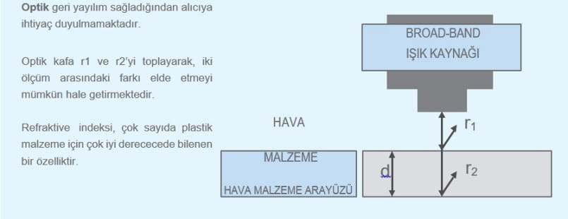 - Sensörün, şeffaf veya yarı şeffaf malzemelere girişim sinyali sağlamak amacı ile r2 bileşeninin yeterli optik yoğunluğa sahip olduğu malzemelerde toplam kalınlığı ölçmek için kullanılması.